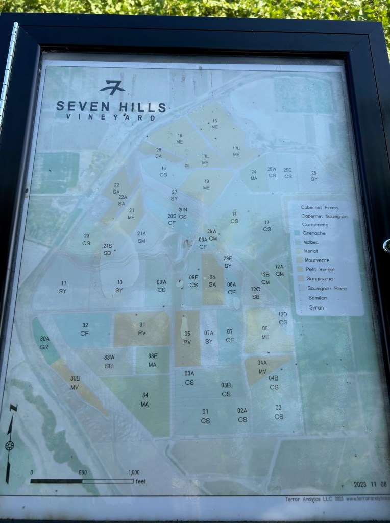 Ortiz talked about the site’s history and elevation (some of which can be found here), and spoke of the challenges of grape growing, and Seven Hills’ commitment to sustainable stewardship. I enjoyed learning about the mustard, arugula, and vetch cover crops that are planted to help manage nematodes (a type of parasitic worm) that feed on vine roots. It’s funny to think that the worms don’t like spicy food…