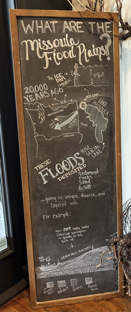 I love this chalkboard illustration of the Missoula Floods, which can be seen in the entry way of Three Rivers Winery and very elegantly explains a series of complex geologic events you’ll hear A LOT about as you taste your way through Washington state.