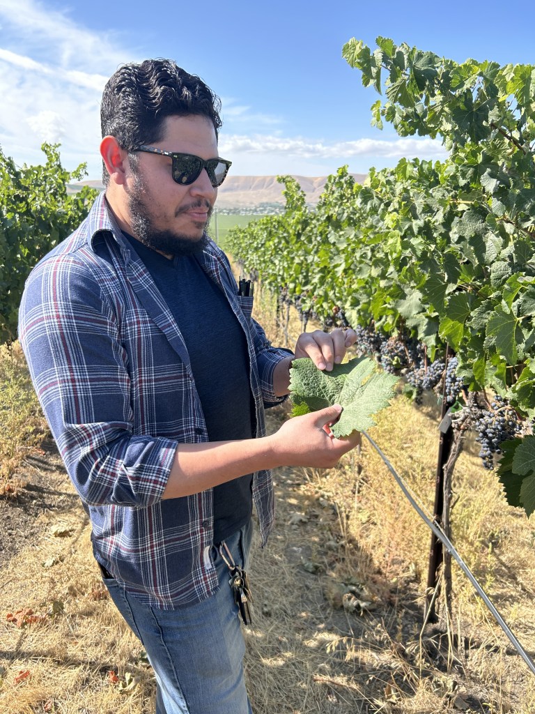 Assistant winemaker Daniel Garcia discusses differences in leaf shapes between malbec and cabernet, at Longwinds.