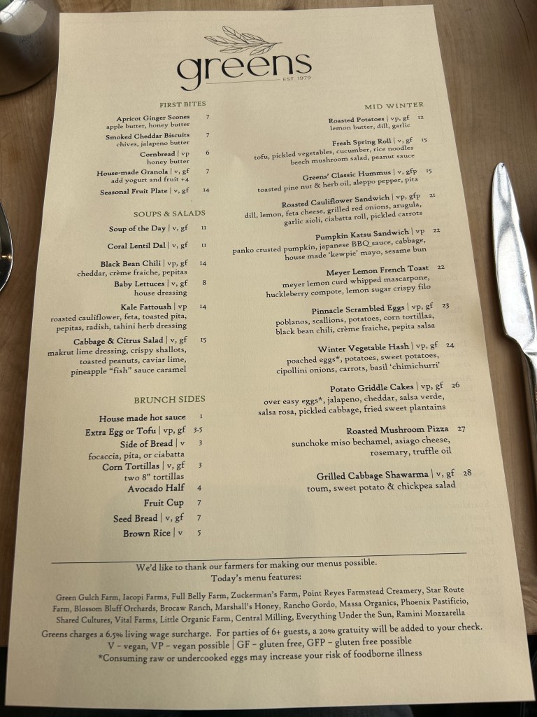 Last week, I tagged along with Toby for a work trip to Napa. We spent a few quick days in San Francisco first—where the number of autonomous cars now make the city’s trolleys resemble horse and buggies—and had a wonderful meal at vegetarian destination Greens, which has been closed or under construction during our last few visits to the area.